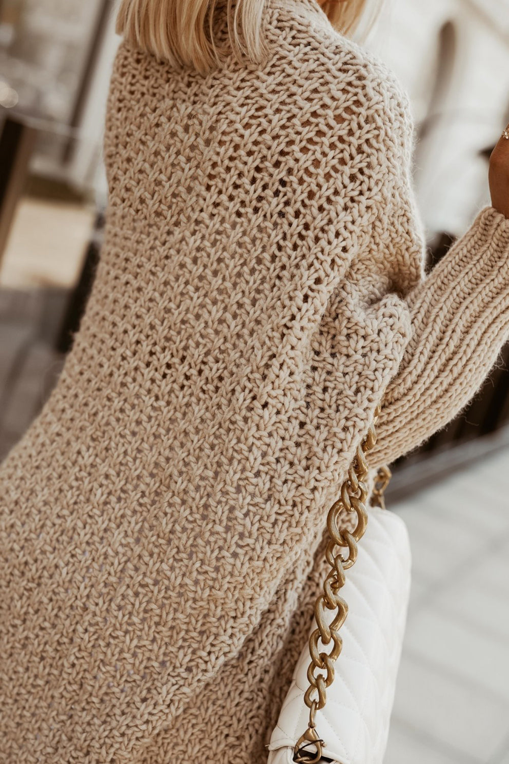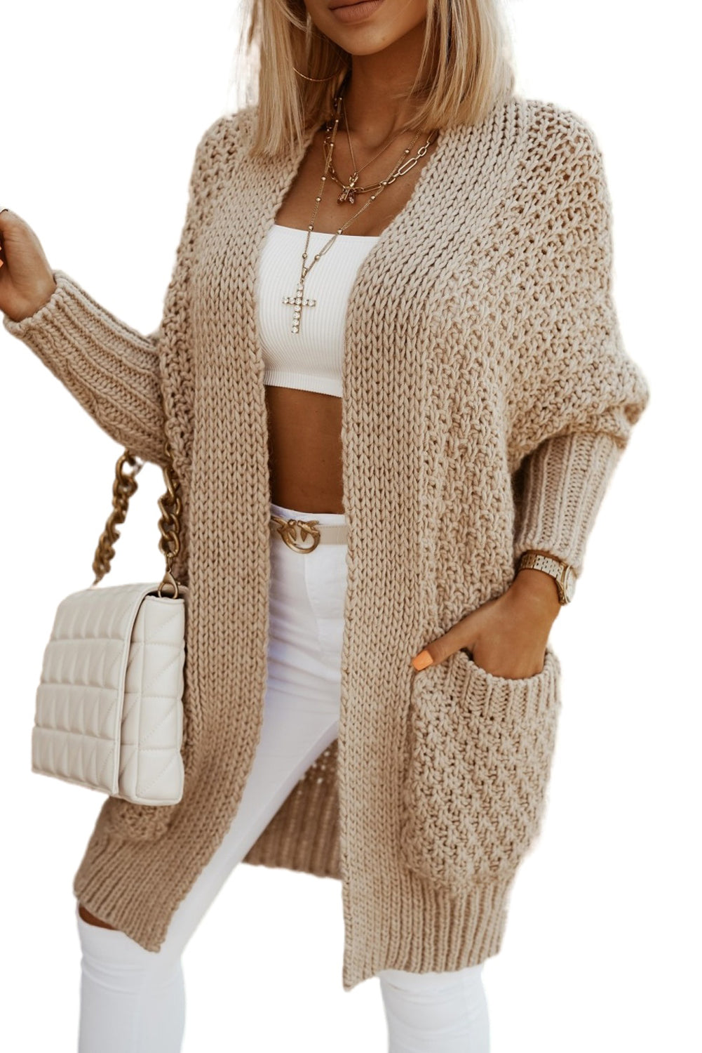 Khaki Open Front Pocket Casual Knitted Sweater