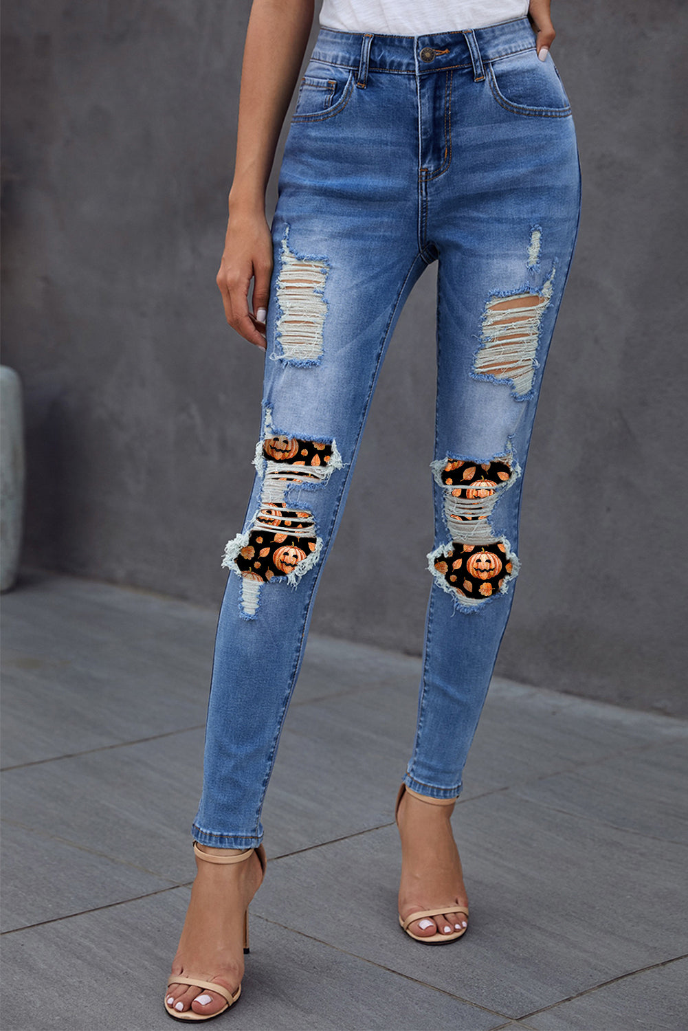 Medium Wash Distressed Halloween Pumpkin Face Patches Skinny Jeans