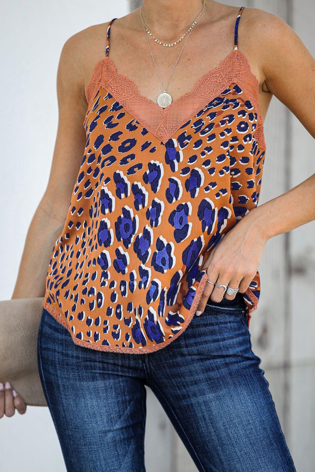 •A leopard print all over, solid toned lace trimmed v-neckline and rounded hemline